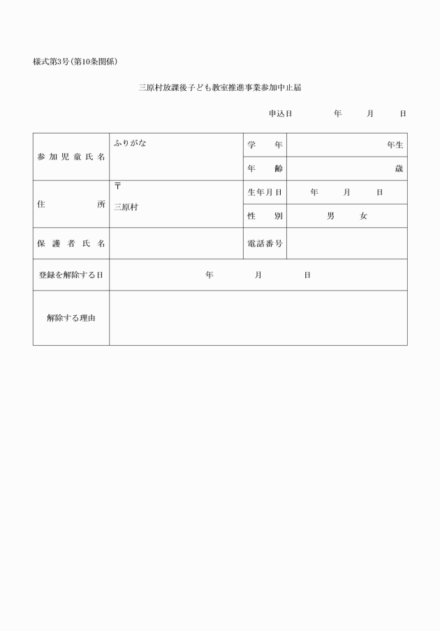第10条 子ども教室に参加する児童の保護者は、子ども教室への参加を中止する場合は、三原村放課後子ども教室推進事業参加中止届(様式第3号)を教育委員会に提出するものとする。