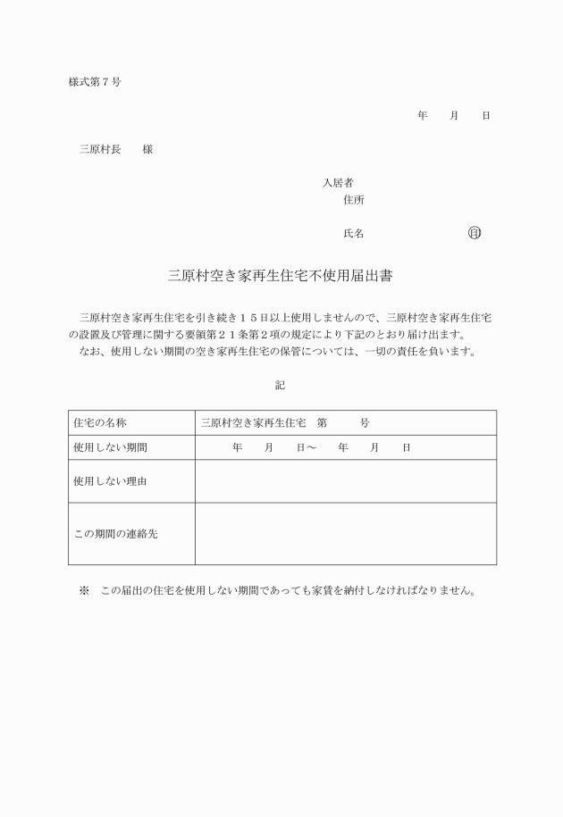 第21条 入居者が、空き家再生住宅を引き続き15日以上使用しないときは、村長の定めるところにより届出をしなければならない。