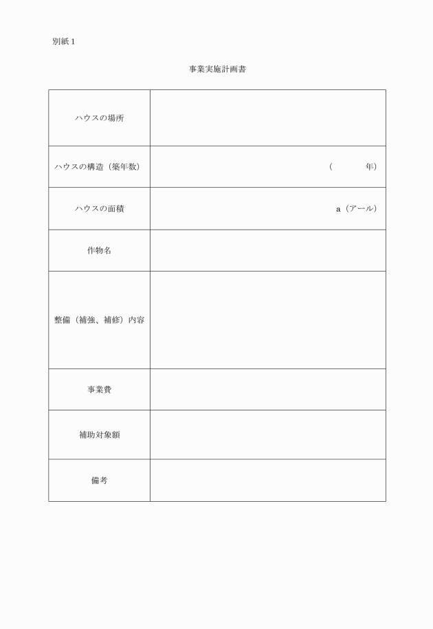 補助対象 | ・国や県、その他補助事業として対象とならない既存ハウス(当該年度の4月1日現在)の補強(補修を含む。)又は施設整備 |