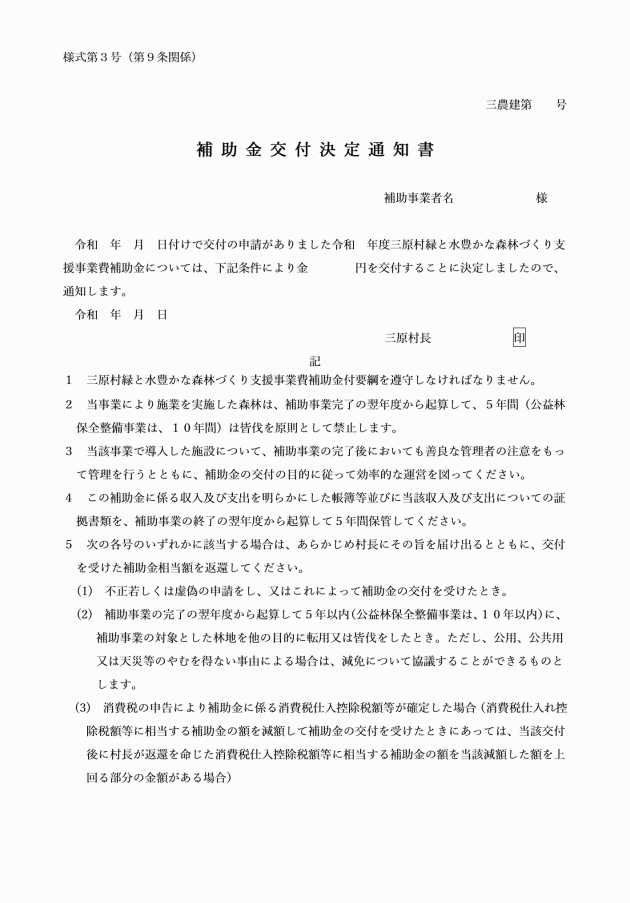 第8条 補助金の交付を申請しようとするものは、補助事業が完了した後速やかに三原村緑と水豊かな森林づくり支援事業費補助金交付申請書を村長に提出しなければならない。